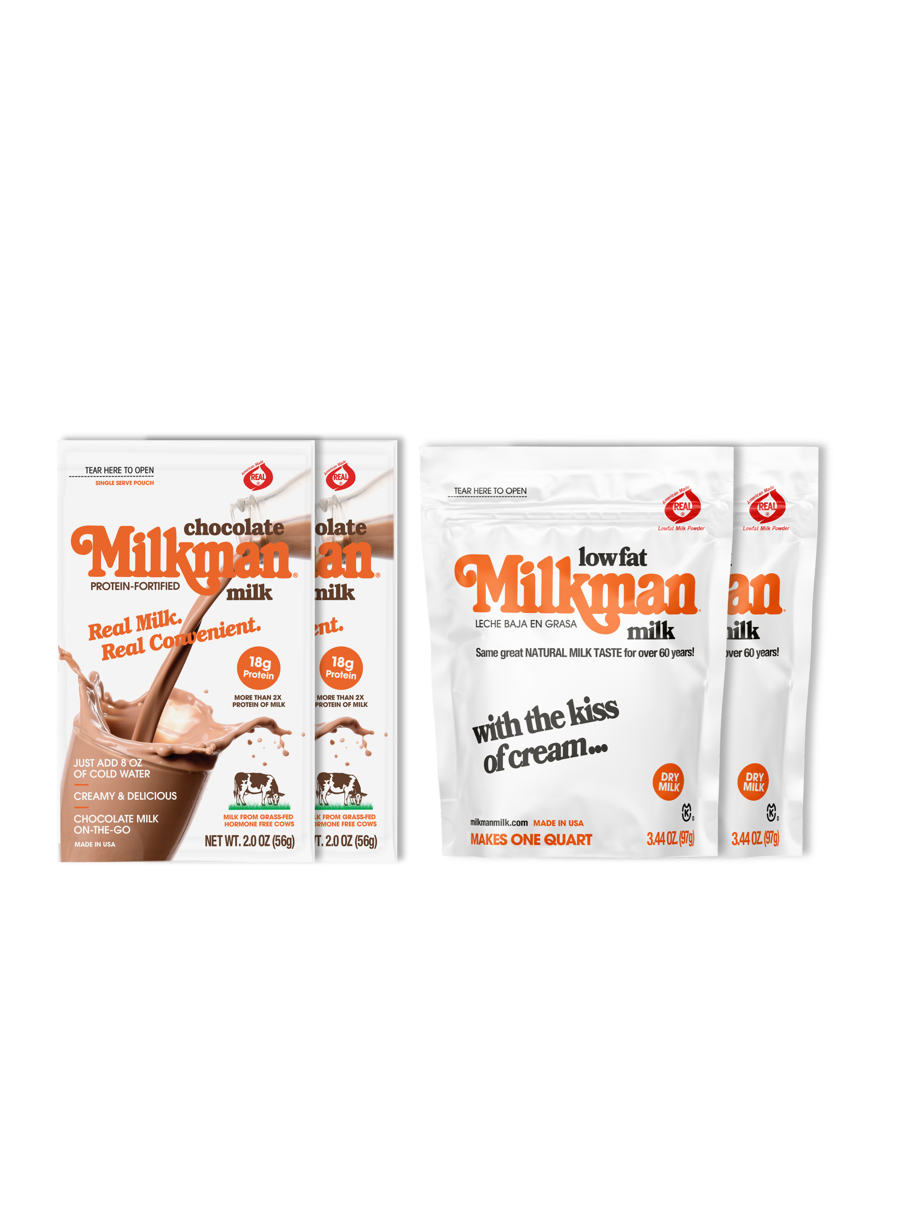 Ready to try Milkman low-fat milk and chocolate milk? Enjoy our sample bundle that comes with 2 packets of each.