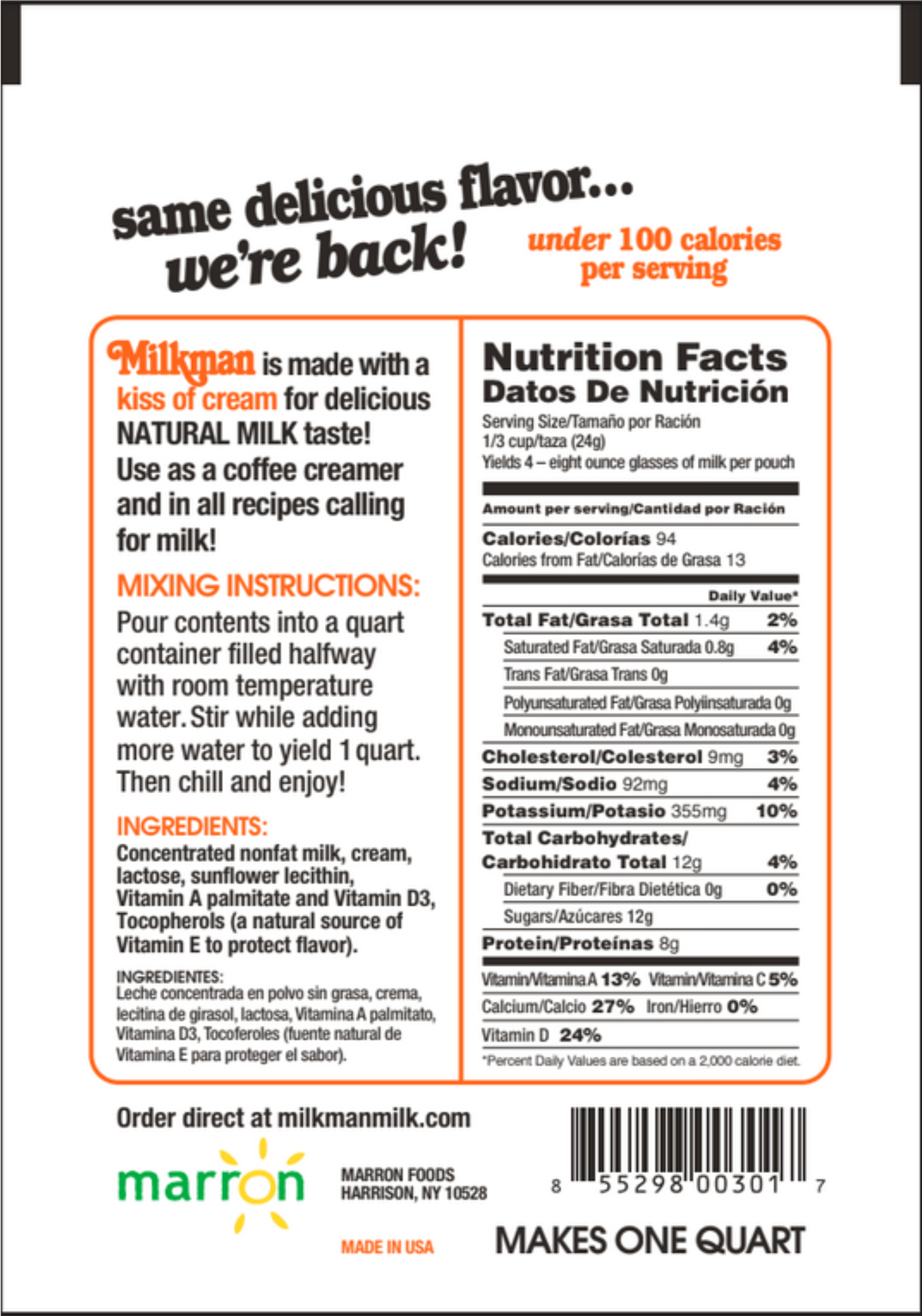 Milkman low-fat milk comes in convenient and portable 1-quart packages and easily dissolves in hot or cold water/beverages. It's perfect ingredient for any recipe that calls for milk